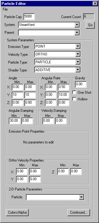 В отличие от отладчика скриптов, редактор частиц имеет очень сложный интерфейс. Это обусловлено множеством возможных настроек для систем частиц в этой игре. Однако он всё же не поддерживает все возможные параметры, вероятно, из-за своей устарелости.