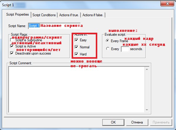 5.Пункт "Active in" указывает, на какой сложности будет срабатывать скрипт. Если сложность только одна, то надо отметить все три уровня сложности