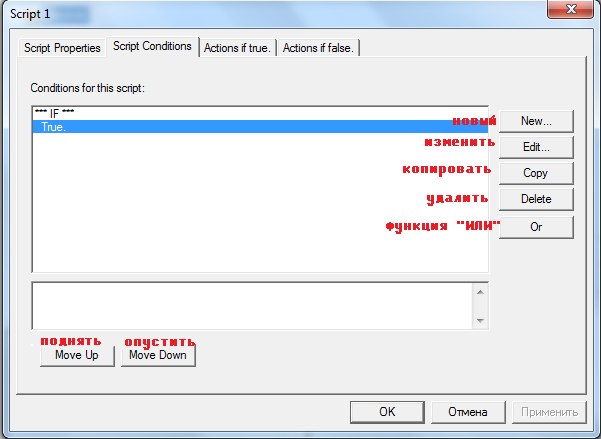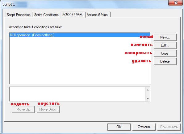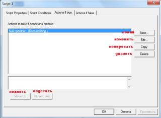 Третья вкладка-действие скрипта. Это-результат выполнения условия. Здесь можно писать от действий для отдельных юнитов и команд до свойств целой карты.