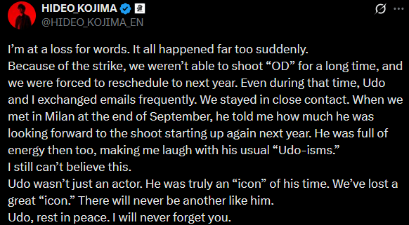 Особенно тяжело новость воспринял Хидео Кодзима: Кир должен был сыграть важную роль в его новой игре OD. Проект задержался из-за забастовки актеров, и съёмки перенесли на следующий год — но Удо оставался в постоянном контакте с Кодзимой и очень ждал возвращения к работе.