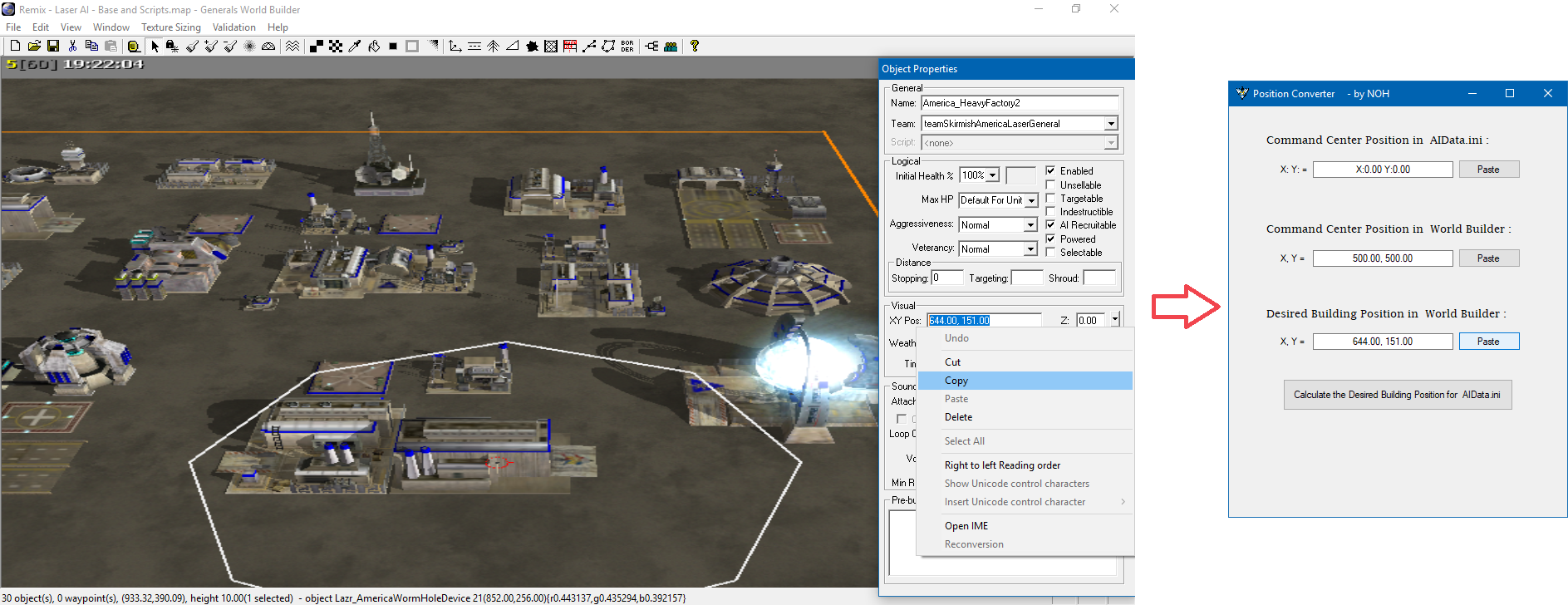 Очень полезный инструмент для моддеров C&C: Generals (CCG) и Zero Hour (ZH), а особенно для тех, кто занимается созданием ИИ. Теперь вы можете полностью спроектировать базу ИИ в World Builder (WB) и получить точные эквивалентные координаты позиций из WB, которые нужно использовать внутри файла AIData.ini (Data\INI\Default).