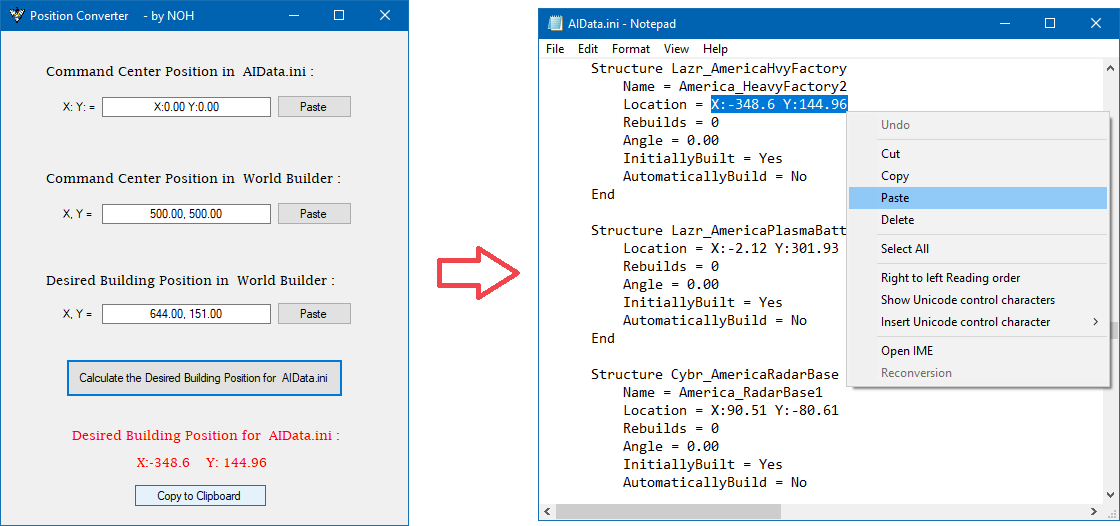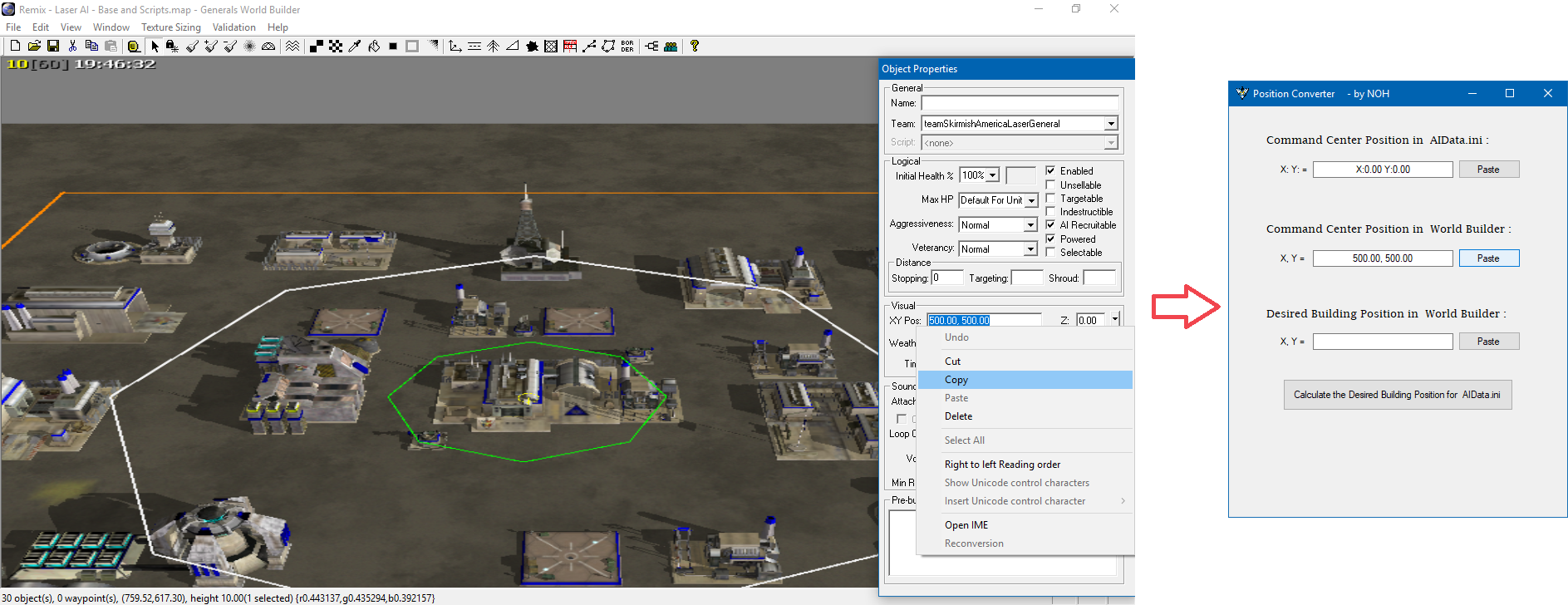 Очень полезный инструмент для создателей ИИ в Generals и Zero Hour, потому что теперь вы можете проектировать базу ИИ в World Builder и сразу узнавать эквивалентные позиции для использования в AIData.ini.