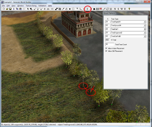 Из Civilian > MISC_MAN_MADE возьмём заборчики и прочие мелочи, а из Civilian > SHRUBBERY возьмём модельки деревьев и кустов, и расставим всё это по карте.