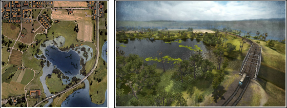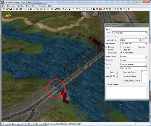 Теперь поставим мост для поезда (напоминаю, мост можно взять из STRUCTURE). Следует отметить, что с точки зрения движка игры, мост это вовсе и не мост, а такой же объект, как и , например, дом. Поэтому придётся повозиться с его установкой на своё место: отрегулировать высоту и подровнять берега.