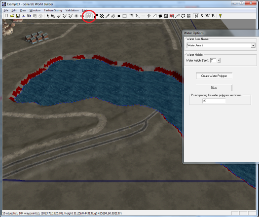 Добавим воду помощью инструмента Water Tool. Воде, как и грунту можно задать высоту в графе Water Height. Можно просто нарисовать по точкам, а можно задать углубление, в пределах которого будет создан (Create Water Polygon) водоём.