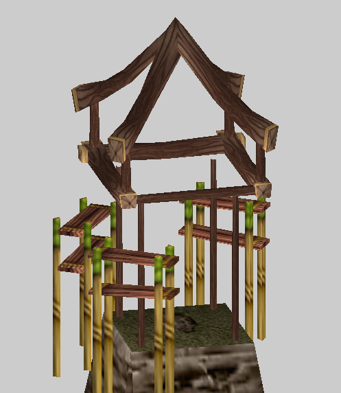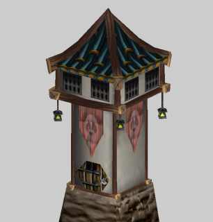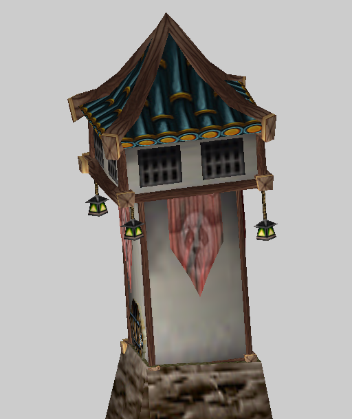 В качестве основы заложена прекрасная и ровная архитектура, что не может не радовать. Но создается впечатление, что автор не довел дело до конца. Было бы неплохо вместо бежевого дерева ночных эльфов использовать более красное. Кончикам деревянной основы явно не хватает завитушек, которые характерны для восточной архитектуры. Развешенные фонарики были очень удачным решением, но почему-то их там оказалось три вместо четырех - и на них отсутствует какой-либо свет. Тимколорные флаги были тоже не самым лучшим решением, слишком бледный получился цвет. В идеале можно было бы использовать текстуры плащей тех же паладинов и вывесить их в такой же форме, как это сделал автор, но из самой башни - по одному на каждому краю (между фонарями). А уже на ткань добавить лицо панды. Для двери явно не хватает косяка. Кажется, в деревянном основе верхней части башни забыли добавить одну деревянную перекладину - справа, если смотреть от двери. И было бы неплохо добавить из каждой бойницы-окна (а их восемь) по одной торчащей стреле, как в сторожевой башне людей.