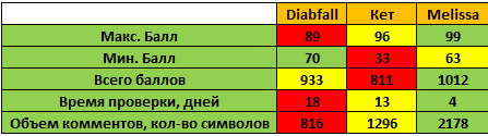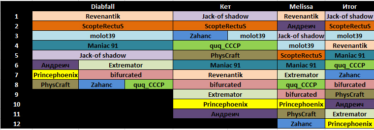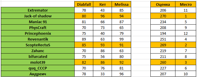 Знаю, что я очень плох как организатор. Самому жаль, что все прошло на низком уровне (неполный судейский состав, некачественное видео, отсутствие анализа спеллов, неграмотные условия конкурса и т.д.). Уверен, многие ждали большей активности с моей стороны, но увы... Еще раз искренне прошу прощения. :) Постараюсь учесть весь негативный и положительный опыт.