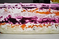 - Натираем свеклу на крупной терке, выкладываем на морковь. Промазываем майонезом.