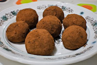 - Вынимаем из холодильника. На плоскую тарелку насыпаем немного какао-порошка. Руками скатываем из какао-массы шарики диаметром 2-3 см, аккуратно обваливаем их в какао-порошке, катая шарики пальцем по тарелке.