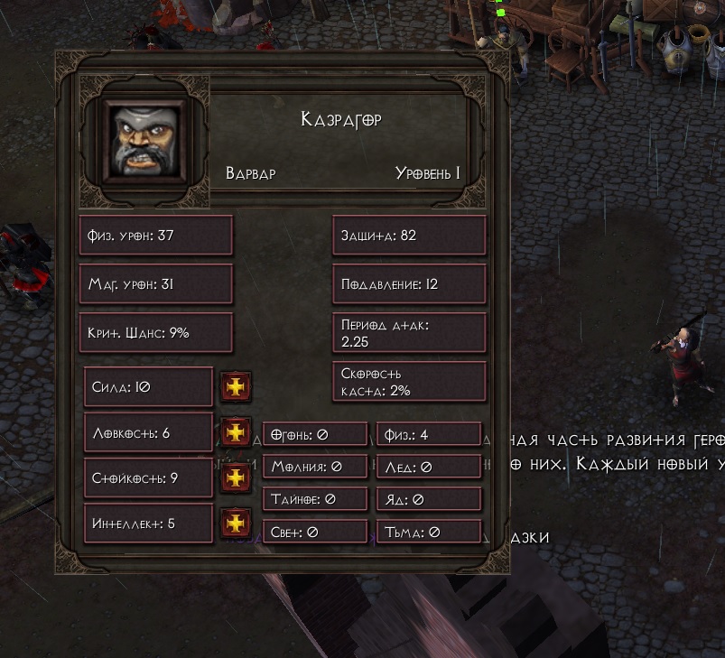 Есть 4 базовые характеристики: Сила, Выносливость, Ловкость, и Интеллект. Каждый новый уровень вам дается 3 очка характеристик, которыми можно повысить любую из них. Сила повышает урон от физических атак, выносливость увеличивает восстановление здоровья и его запас, ловкость увеличивает физическую защиту на 2 за каждое очко, интеллект увеличивает силу магии, запас маны и ее восстановление.
