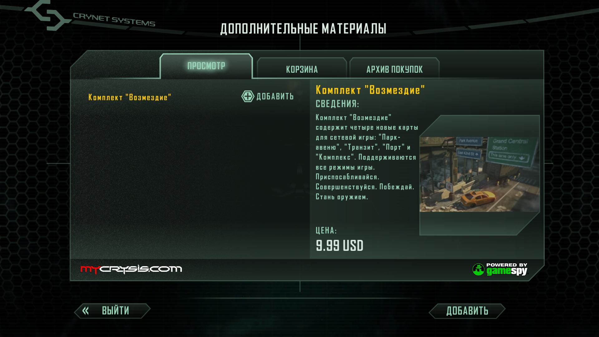 После покупки вам будет предложено скачивание набора карт "Возмездие" в архиве ZIP. Скачайте и переместите в папку : Мой компьютер -> Пользователи -> Мои документы -> Crysis 2 -> DLC