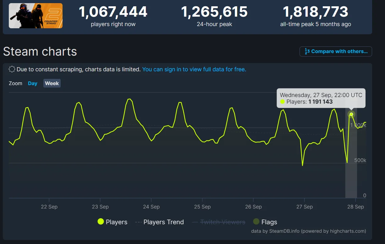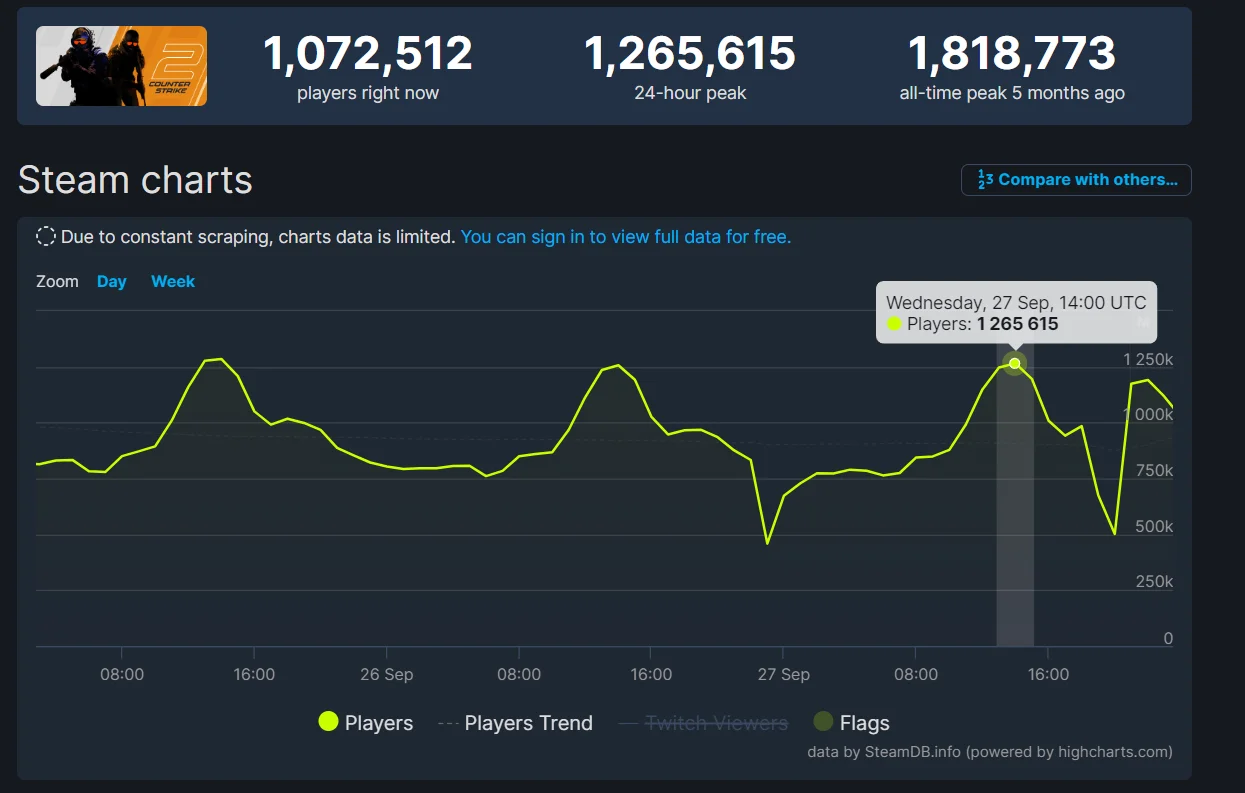 Согласно SteamDB, пиковый суточный онлайн Counter-Strike 2 в Steam достиг отметки в 1,265,615 человек (в 14:00 UTC), но произошло это ещё до официального запуска новинки (в 19:00 UTC). После запуска максимальное количество одновременных игроков составило 1,191,143 человек.