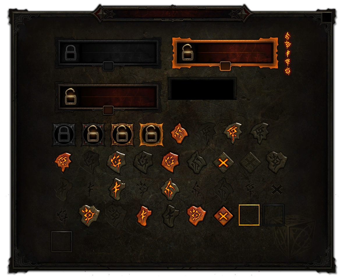 В сети появилось несколько скриншотов нового интерфейса Рун, сделанные в недавно вышедшем 13-ом патче. На изображении представлена так называемая панель умений, что вполне возможно будет новым интерфейсом скиллов. Некоторые элементы пока не доступны, зато сами руны уже есть, но явно, что не хватает описания, подсказок и других интерактивных элементов.