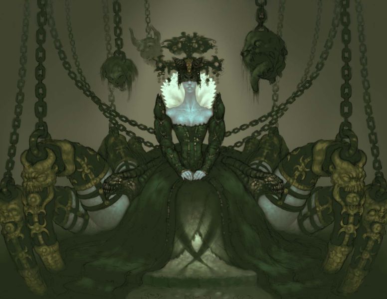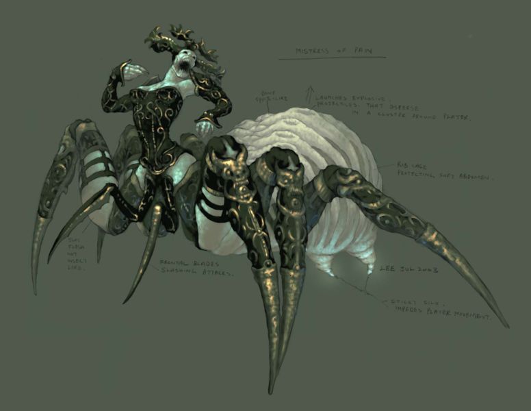 Повелительница Боли - демон арахнид, предпочитает носить вещи в стиле ретро, порванное старинное платье и женский головной убор. На первой зарисовке ее лицо было скрыто под вуалью, но другие рисунки показывают насколько оно на самом деле омерзительно, так, же как и некоторые поразительные особенности.