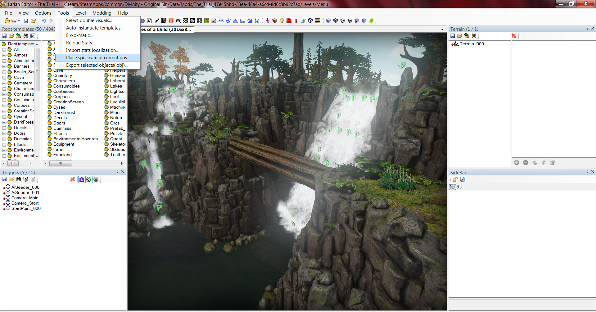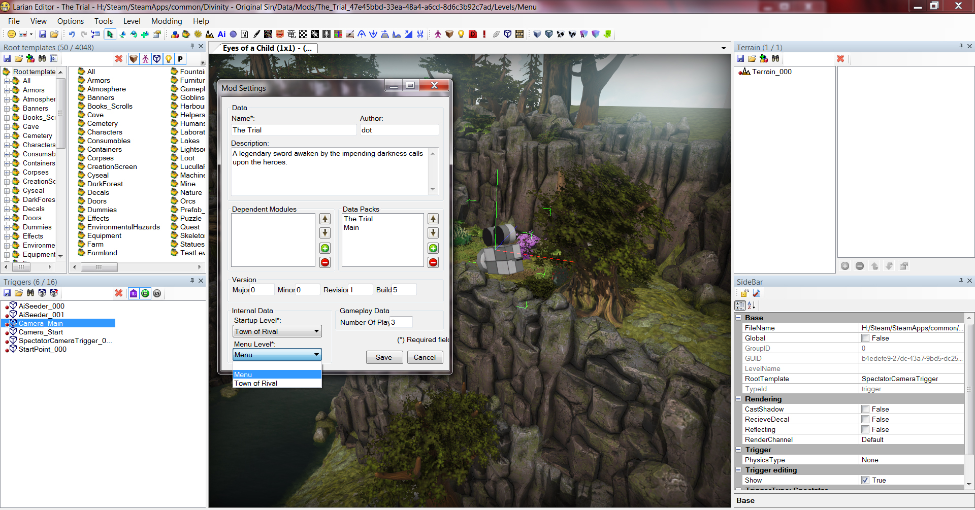 Редактор создаст новую камеру, теперь вы можете передвинуть обзор чуть дальше чтобы увидеть её в окне рендера. Выберите камеру и откройте панель треггеров. Ваша камера будет называться "SpectatorCameraTrigger_000". Вы должны переименовать её в "Camera_Main" (именно так, тогда игра подцепит эту камеру и будет её использовать для меню)