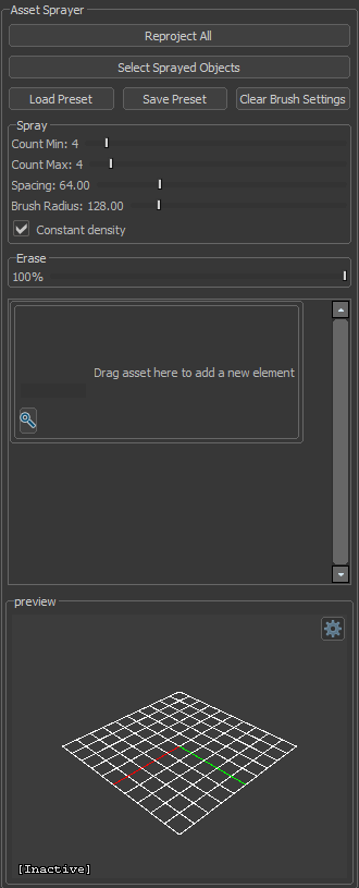 • Drag asset here to add a new element (Добавить элементы в кисть) - Нажав на маленькую кнопку лупы, вы попадаете в Копилку, где выбираете модель для кисти, и затем появляется панель с новыми параметрами для этой отдельной кисти. Можно добавлять сколько угодно моделей в группу распыления.