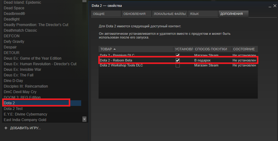 3) В графе "Загружаемый контент" жмем галочку Dota Reborn Beta