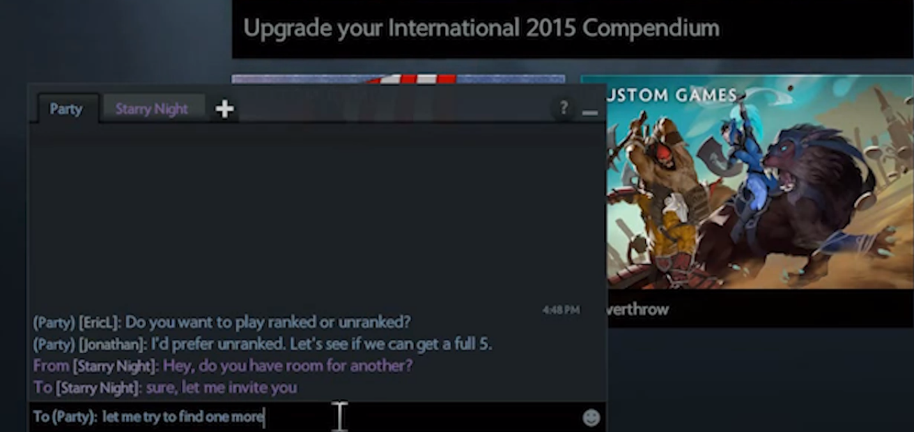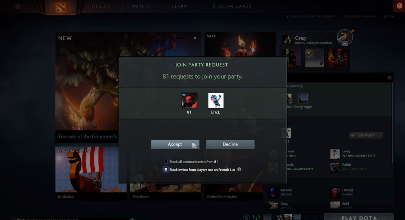 Найти друзей для игры удобно как никогда - в этом вам помогут новые функции объединения групп и значок поиска дополнительных игроков, который виден всем вашим друзьям. Дота лучше, когда вы играете вместе!