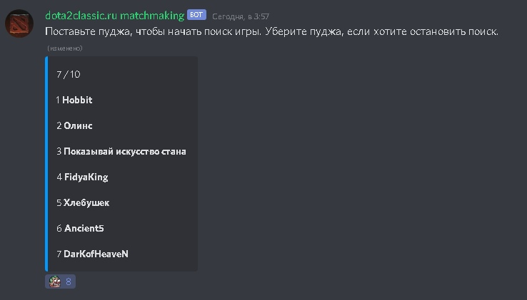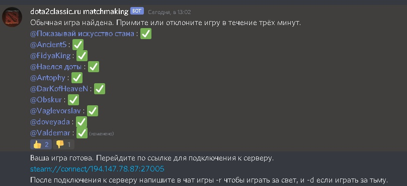 По причине того, что в старом клиенте Dota 2 не доступен внутриигровой матчмейкинг, мы решили реализовать его через Discord и выделенные сервера. Таким образом, у нас есть #рейтинг и #обычный поиск игры. Рейтинговые игры доступны только обладателям роли @Древний, которую можно получить после нескольких успешных матчей в обычном поиске игры. Когда в поиске набирается 10 человек, бот @dota2classic.ru matchmaking отправляет личное сообщение, в котором можно принять или отклонить найденную игру. После того как все 10 человек приняли игру, автоматически запускается выделенный сервер и каждому игроку приходит личное сообщение с краткой инструкцией о том как подключиться к своему матчу.
