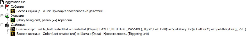 Триггеры на получение приказов в точку или на вражескую цель по сути копируют друг друга, планирую всё это оптимизировать, когда добавлю хеш-таблицу. Таймер каждые 0.10 секунд выбирает юнитов со способностью на основе Бродячего, но без баффа и забирает её и лишение атаки.