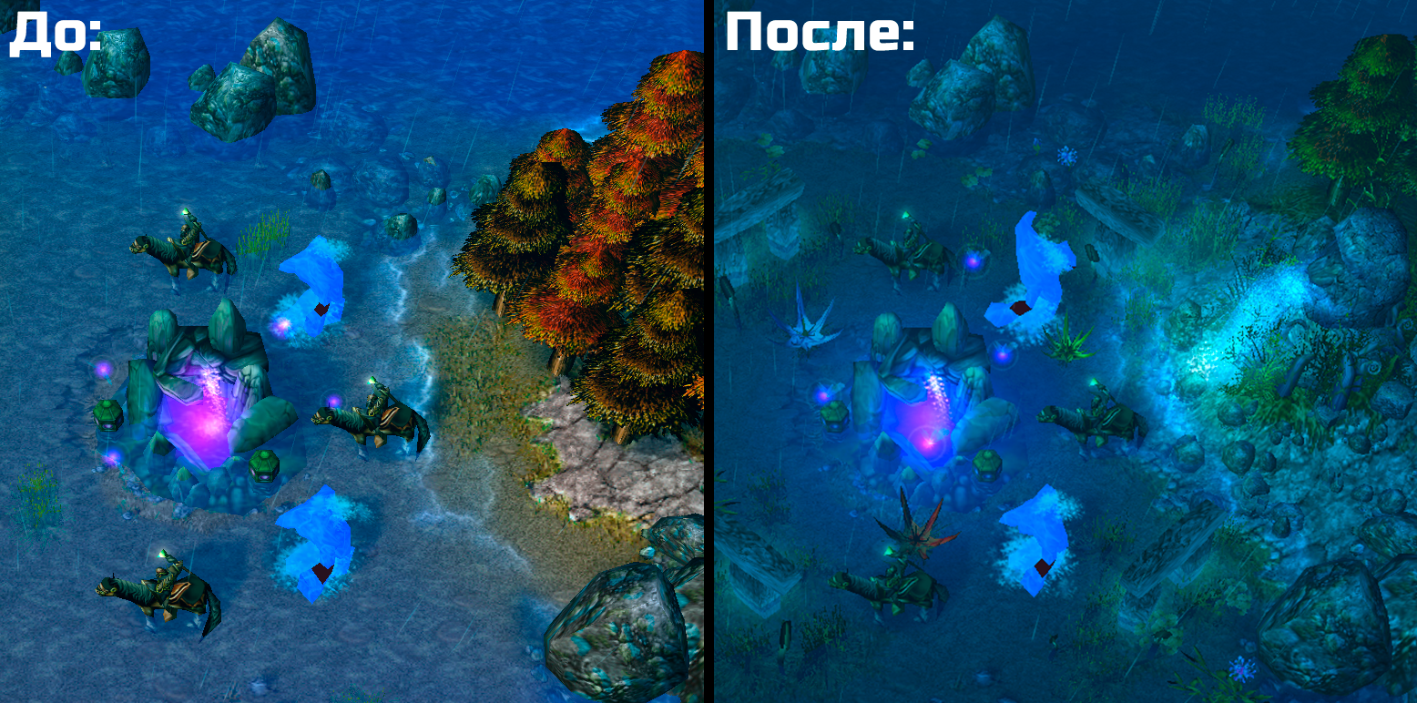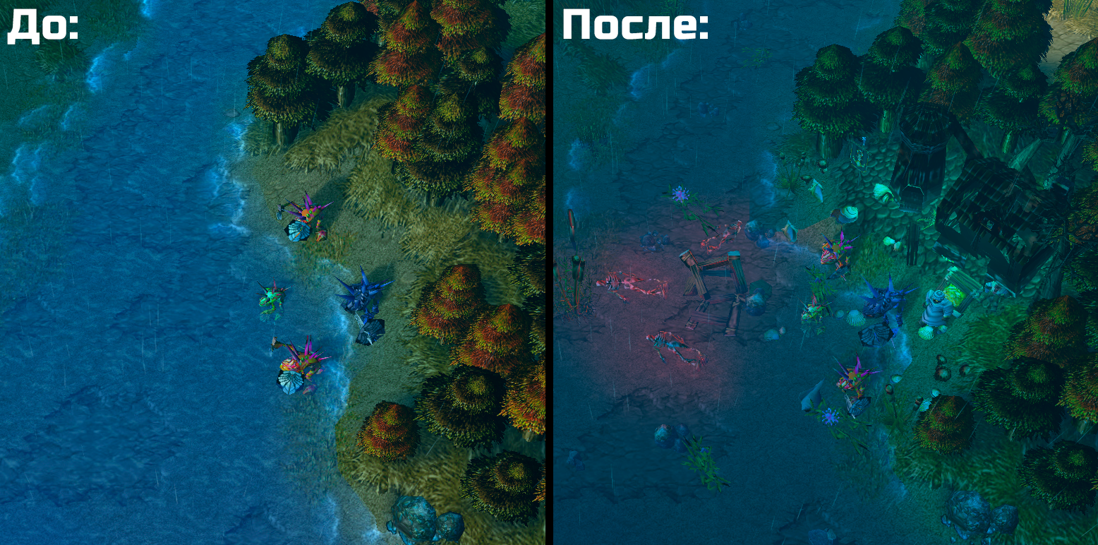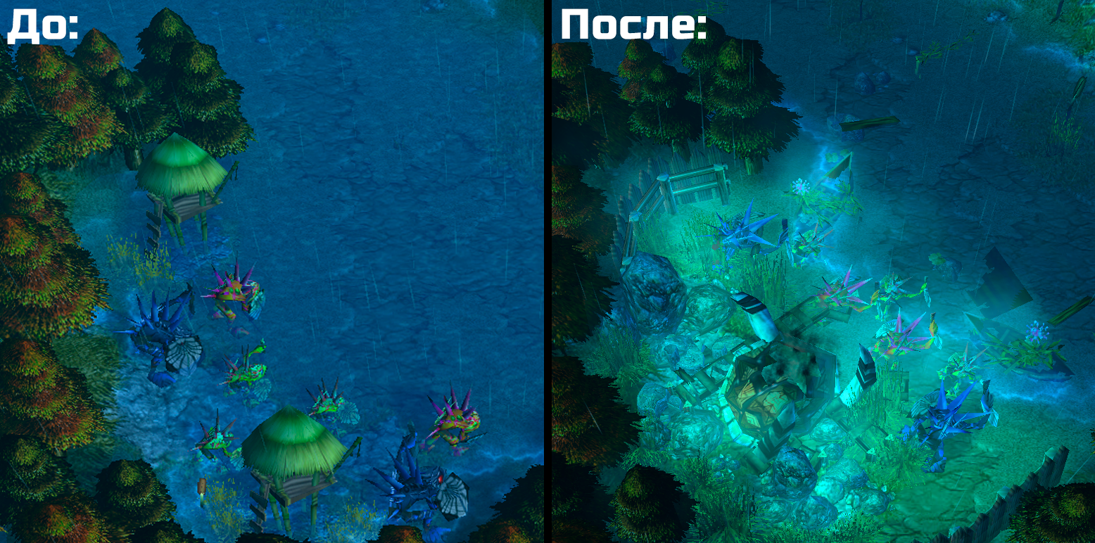 Насчёт освещения. Используется и освещение движка, и Глоу модели. При чём последние двух видов: один вид выглядит, как свет под героями, второй - билбоардед.