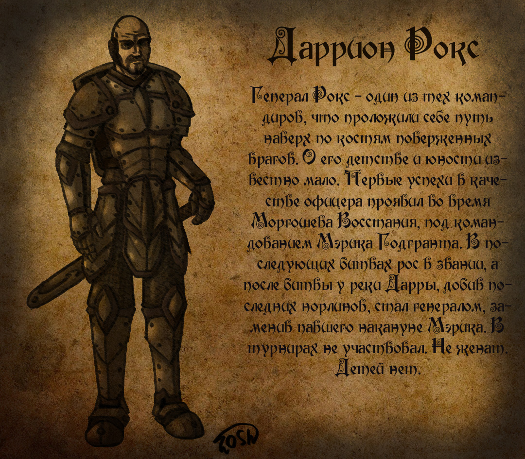 Потом стал десятником. К началу Моргошева Восстания, когда один из сыновей норлинского князя дикарей вздумал если не захватить трон, то отколоться от Королевства, Рокс уже был сотником. Тогда их воинство, под командованием Мэрика Костлявого, бросили в самое пекло. Битвы превратились в одну сплошную бойню, и теперь не припомнишь и половины. Рокс стал командовать тысячей после взятия Орд-Марна, старого тингрийского форта, заняв позицию у фланга основного Моргошева войска, и отрезав путь к отступлению через Красную долину. Основные силы Мэрика разгромили норлинов, а Рокс у берега Дарры добил показавших спину и получил красивую почетную нашивку на мундир. Его назначили генералом там же, у реки Дарры. Он не помнил имени своих родителей, но рыцарю нужно имя. Тогда он стал Даррионом.