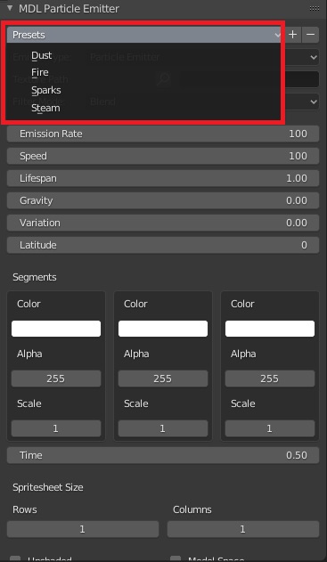 У нас имеется несколько пресетов для частиц: пыль, огонь, искры и пар. У них сразу настроены все парамтры, так что нам остаётся только подкрутить цвет, скорость, выделение за секунду ну и возможно гравитацию.