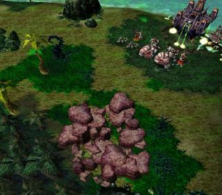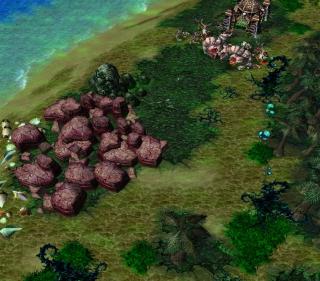 Остров орков - деревья из пустоши, вместо травы редкая трава, кактусы, останки древних животных, копья, факела, черепа на кольях, груды черепов.