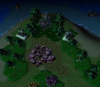 Остров эльфов - деревья ашенваль, много тёмной травы, много растений, статуи эльфов.