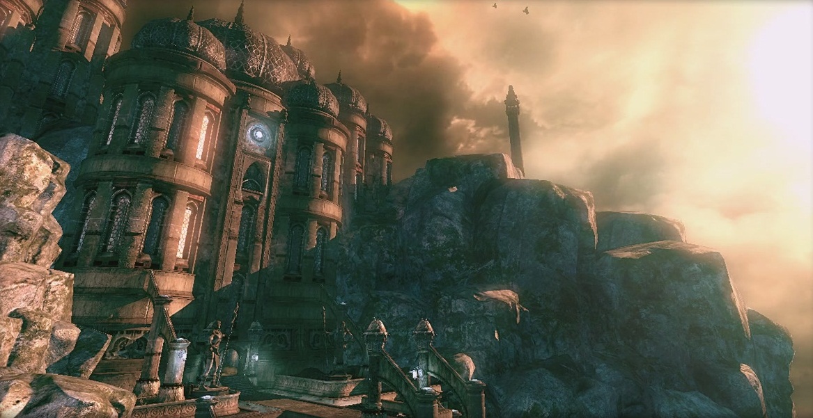 Для основы мы используем модель DecoPillar4 из NEC_Pillars. Основной масштаб 3.00. Основной частью колонны будет столб Ornatepillar01 оттуда же, отмасштабированный до 1.25. Кроме того, его нужно повернуть на 90 градусов, чтобы синий "глазик" смотрел на вас. В качестве верхушки нам сгодится BabelSpireB из NEC_Deco. Масштаб тут несколько странный - 0.91, он подходит наиболее лучшим образом. Тем не менее, заметен небольшой зазор между этой верхушкой и столбом, увы, нам его придется оставить. Если горите желанием, можете поэкспериментировать с масштабом или подобрать другую, более подходящую модель, но я остановился на этом. Итак, выравниваем колонну по оси X (красная стрелочка), и надвигаем ее на арку так, чтобы ножка арки полностью была внутри колонны, безо всяких выступающих частей. Как и договаривались, колонну копируем и передвигаем на другую сторону арки. Если нужно, всю эту конструкцию, включая арку двери и створки, выровняйте относительно дорожки. Результат: