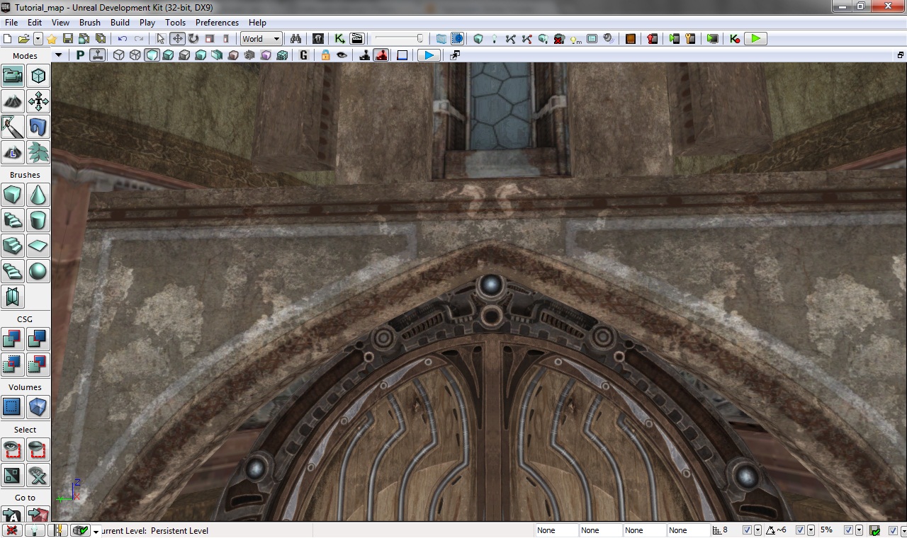 Теперь, если присмотреться на скриншот уровня, можно увидеть, что над аркой двери есть еще одна арка, уже скорей похожая на стену. Ее можно найти в NEC_Walls под именем CAWall_STRa (кто помнит, мы использовали ее при создании центральной секции). Сделайте так, чтобы она немного наехала на макушку дверной арки (как на рисунке ниже) и немного сдвиньте ее вперед, чтобы она "нависала" над дверьми.