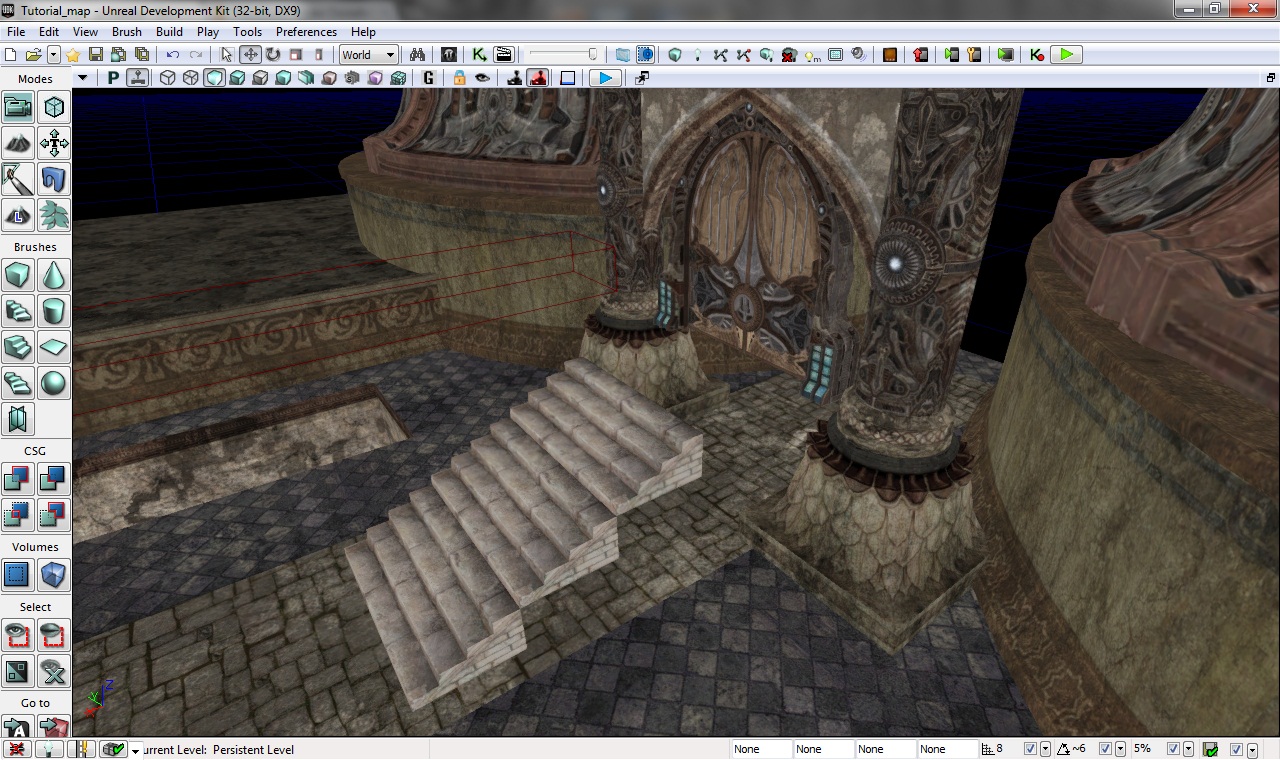 А начнем мы это дело с лестницы. Находится она в ASC_Floor, это единственная лестница, да и единственный статик меш, в этом паке. Добавьте на уровень, общий масштаб поменяйте на 0.75, разверните, сделайте копию, переместите ее так, чтобы она была продолжением оригинала, сделайте вторую копию, повторите ту же процедуру относительно первой копии. Большую лестницу (на ней должно быть 12 ступенек) постарайтесь выровнять по центру дорожки.