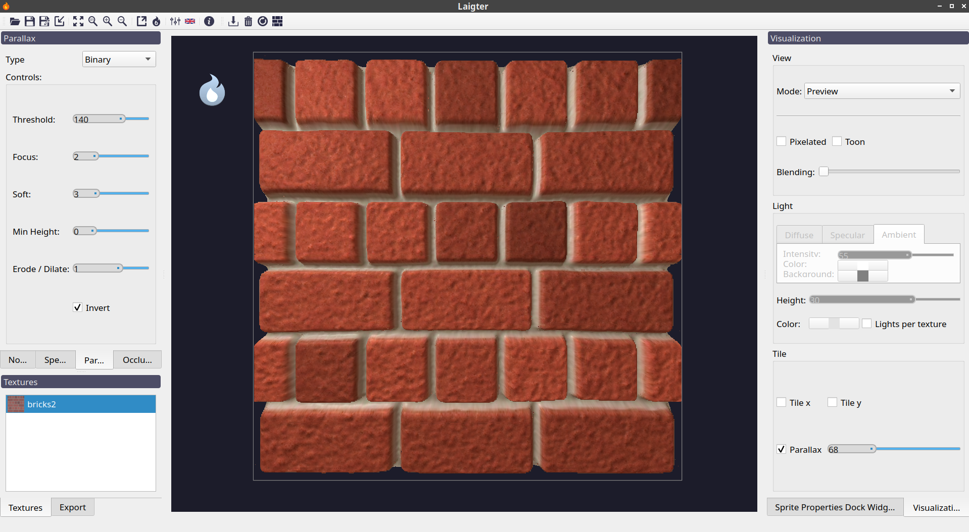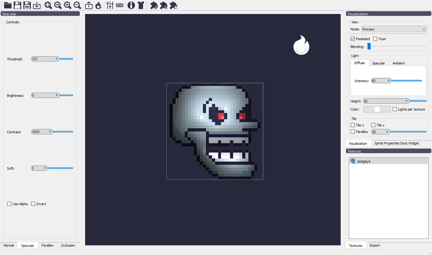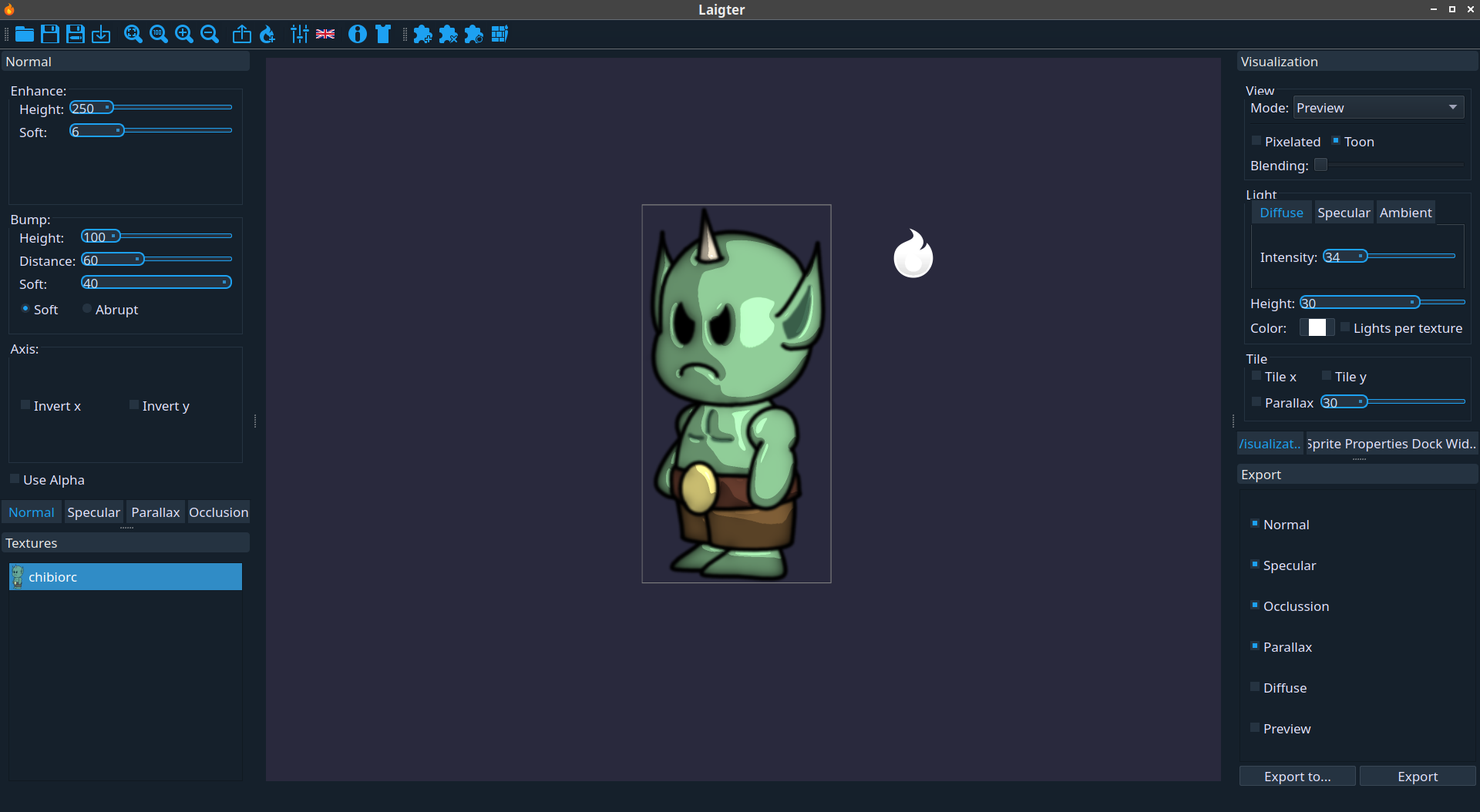 Laigter - бесплатный инструмент с открытым исходным кодом, который позволяет создавать карты нормалей для 2D-текстур без особых усилий. Специально разработан для спрайтов в 2D-играх. Помимо этого возможна генерация карты specular (интенсивность поглощения света), которая придаст спрайтам блеск, чтобы они выглядели профессионально!