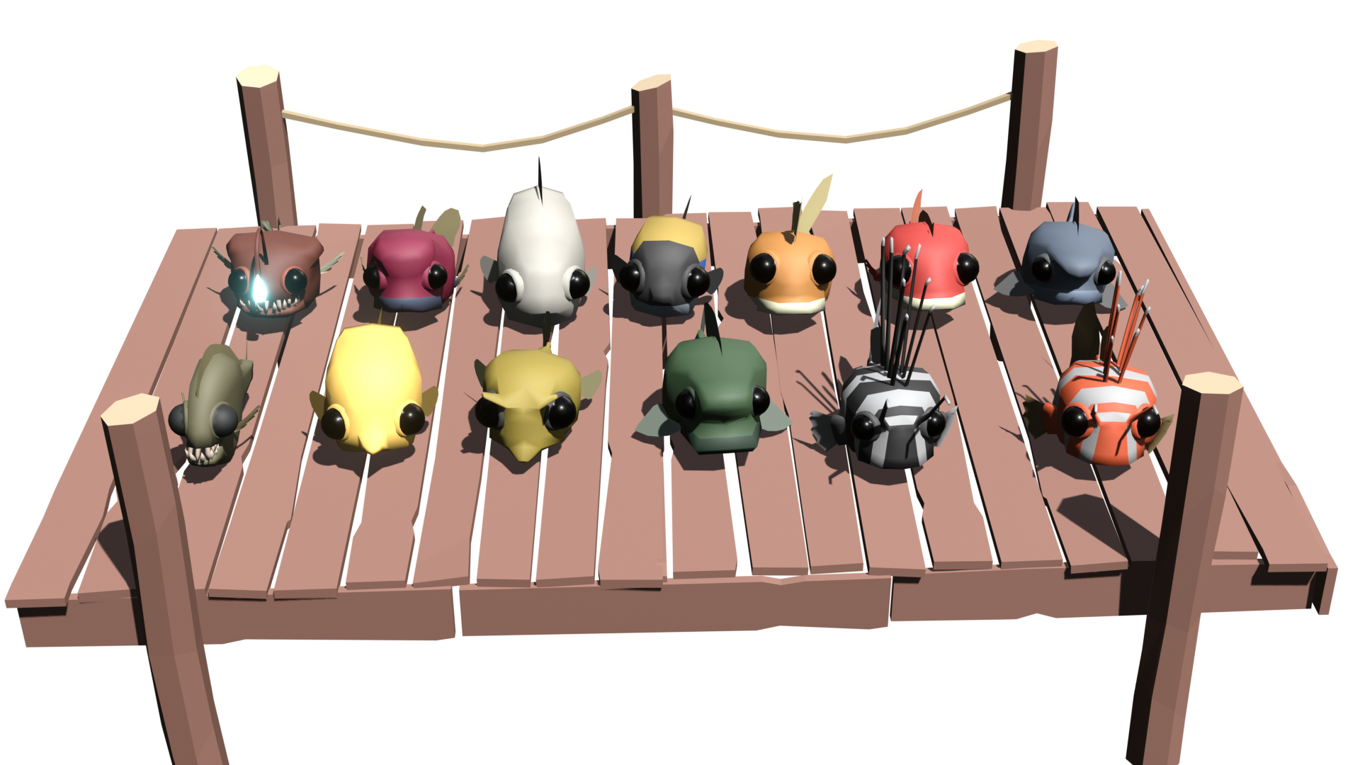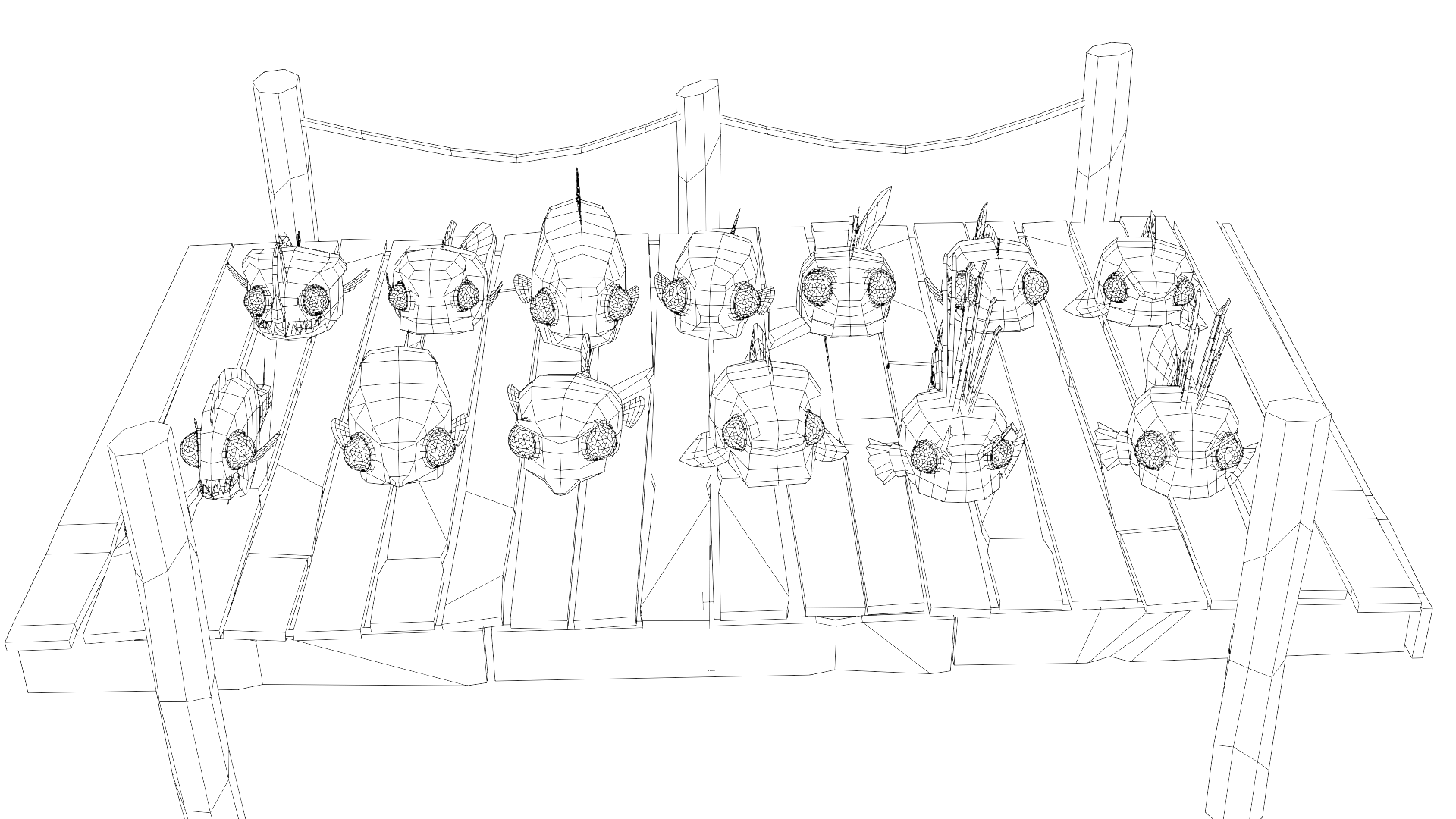 Набор из 52 моделей, включающий в себя: модели рыб, удочки, лодку, пирс, рыболовные снасти. Модели не имеют текстур (цвет задан в материале). Модели рыб анимированы (присутствуют анимации атаки, гибели, бултыхания вне воды, несколько видов плавания)