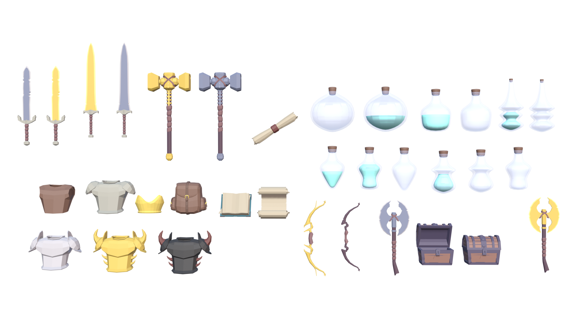 Набор моделей разнообразных предметов: оружие как ближнего, так и дальнего боя; доспехи, склянку зелий, книги, свитки и прочее, - в количестве 106 шт. Модели не имеют анимаций и текстур (цвет задан материалов).