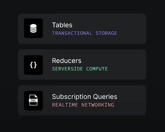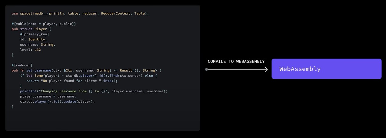 Ваш код (пока доступны два языка Rust и C#), где вы определяете структуру таблицы, как в каких-нибудь ORM фреймворках используя язык программирования. И редуктор - функция где находится ваша серверная логика. Весь ваш написанный код компилируется в WebAssembly и загружается в SpacetimeDB. В будущем они добавят ещё больше поддержки для других языков программирования, которые так же смогут компилироваться в WebAssembly по их API и выполняться на сервере. Так как это open-source проект, то некоторые люди написали какую-то поддержку для языка Zig.