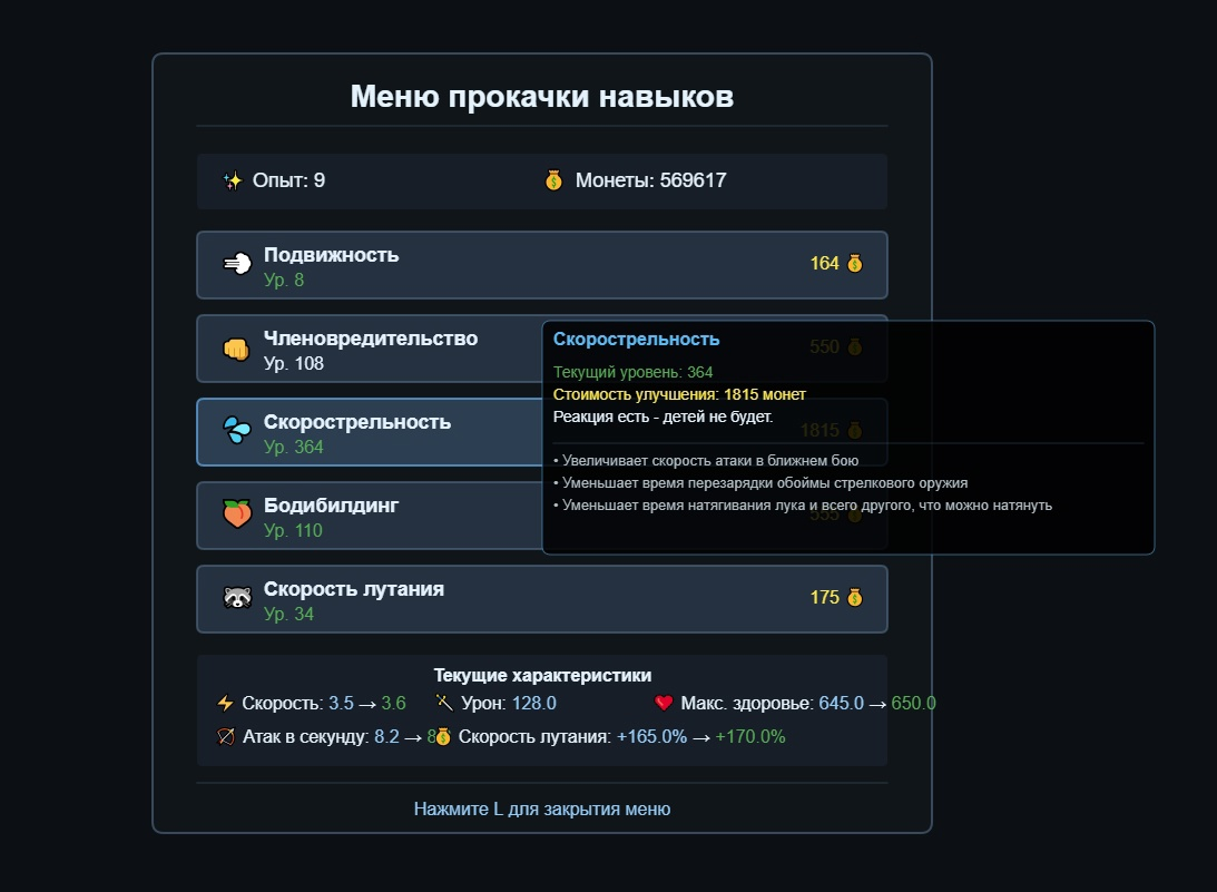 - Если зашли далеко и стало очень тяжело - не стыдно умереть, чтобы откатиться к более лёгким локациям (в данный момент прокачка от этого не теряется, так как ещё нет мета-развития)