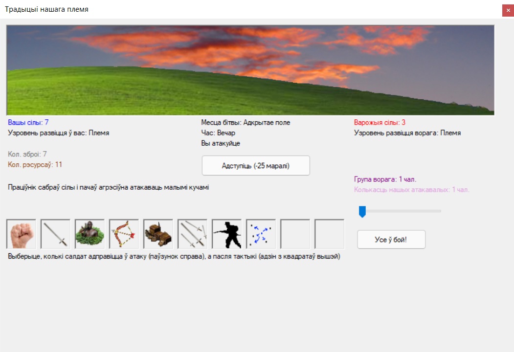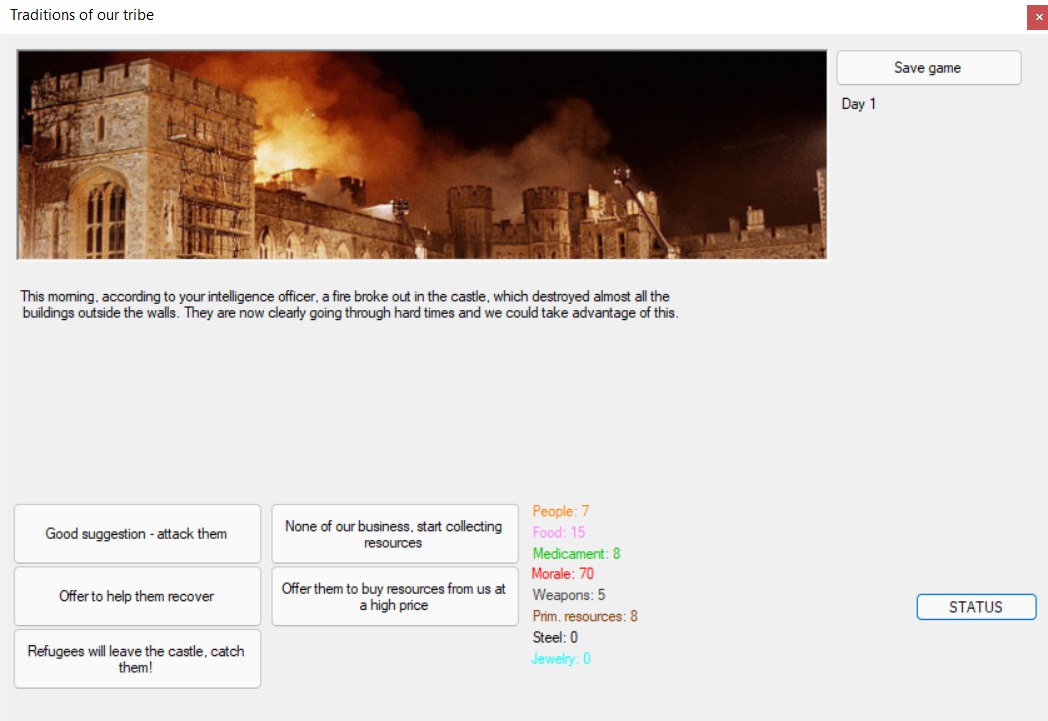 Одна из моих первых игр, написанных на C#. Представляет из себя полу-текстовый симулятор племени, которое выживает в мире с соседями, чуть более продвинутыми чем они (вдохновлено Rimworld'ом), ибо есть как и средневековые замки с феодалами, так и полноценно развитые города, со всеми ими придётся как то выстраивать отношения.