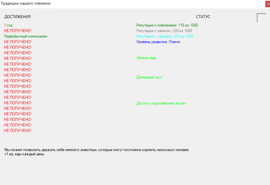 Вдобавок у нас ещё есть такое окошко, где вы можете дополнительно посмотреть состояния вашего поселения, репутацию и выполненные достижения