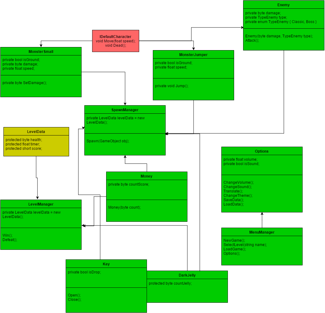 Вам не обязательно вникать в каждую мелочь, которая здесь изображена. Зелёным цветом я пометил классы, которые будут созданы. Красным - интерфейсы. Жёлтым - структуры. В самих классах я описал переменные, которые будут в классе, и методы. Всё, что соединено стрелочкой, означает, что класс либо наследуется от такого-то класса или как-то с ним связан. Например у нас в игре есть тёмное жиле. Этот класс не наследует класс LevelManager и SpawnManager. Он лишь связан с ними какими-то действиями. Он будет создаваться на каждом уровне и отображаться в интерфейсе игрока.