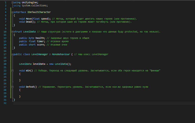 Далее не буду демонстрировать написание уже самих функций класса т.к. каждый работает с разным инструментарием. Здесь я демонстрирую лишь сам класс. Как он выглядел в диаграммах, и как он выглядит в коде игры.