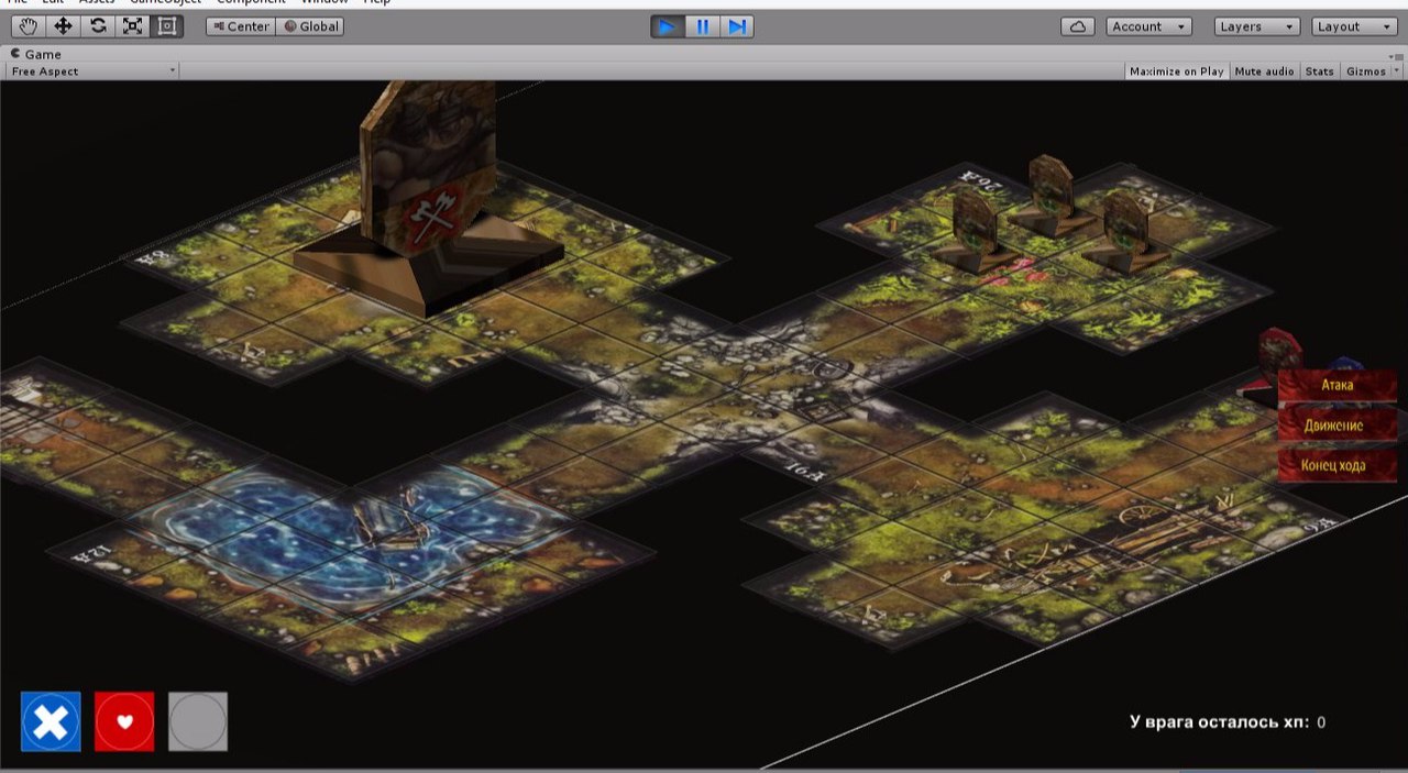 За 24 часа мы сделали основную механику: перемещение персов, атака, бросание кубиков и так далее, сделали GUI. Много что мы хотели не смогли реализовать вовремя.