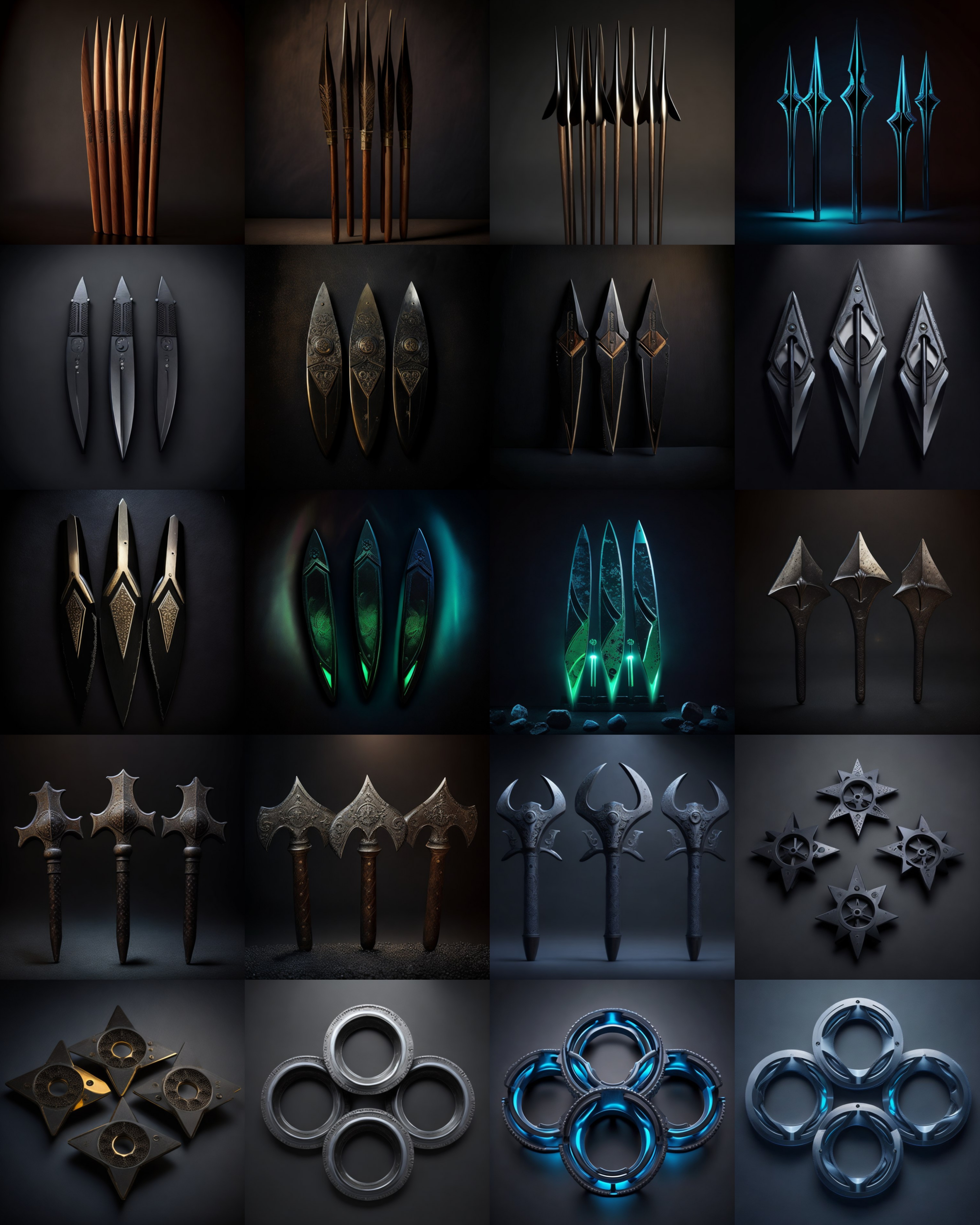 Набор из 22 иконок различного ручного метательного оружия, созданного с помощью ИИ