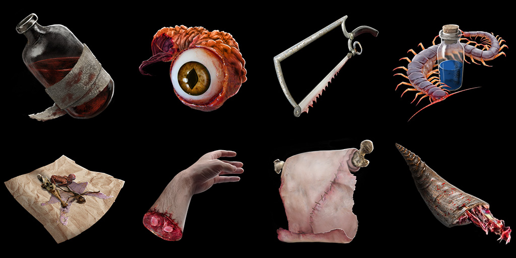 Набор иконок на тему "ресурсы и расходники" в количестве 8 шт. в сеттинге "темное фэнтези".