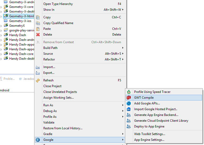Установить GWT (плагин для Eclipse) и в контекстном меню html подпроекта выбрать Google - GWT Compile. Вас попросят указать war папку, она находится в html-подпроекте.