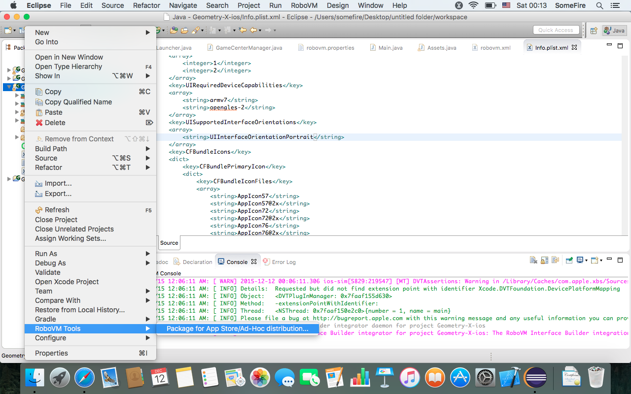 Жмём ПКМ по iOS проекту и выбираем RoboVM Tools - Package for App-Store/Adhoc Distribution.