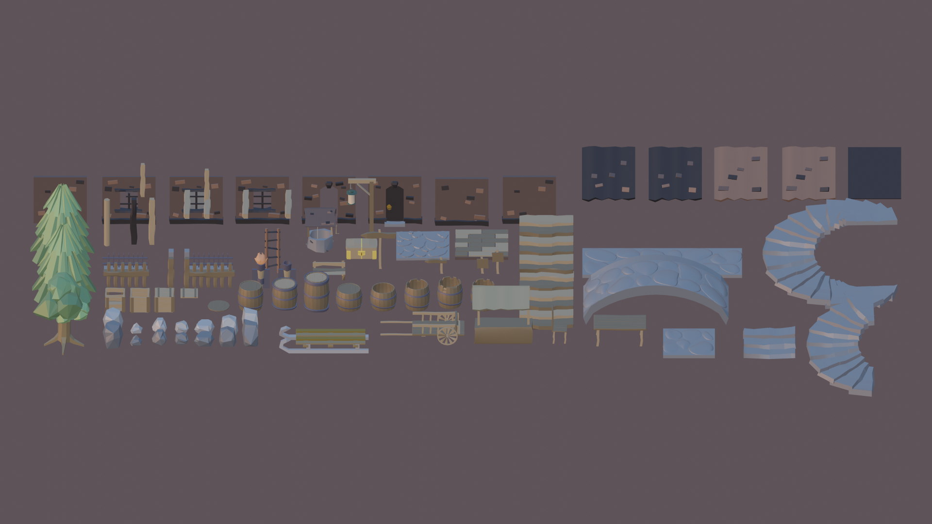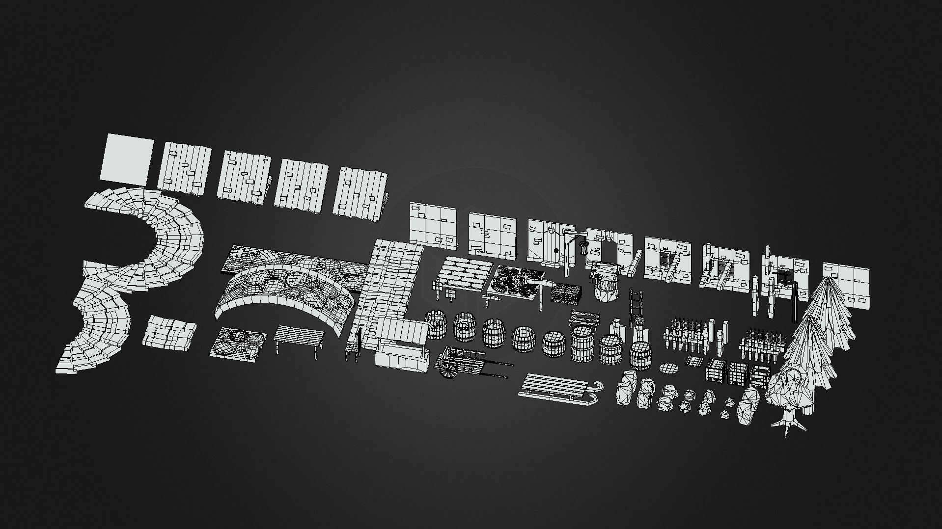 Модульный low-poly набор (с цветом материала, без текстур) для создания городских локаций. все модели представлены отдельными мешами, некоторые из которых (ящики, крыши и т.д.) можно разобрать по досточкам.