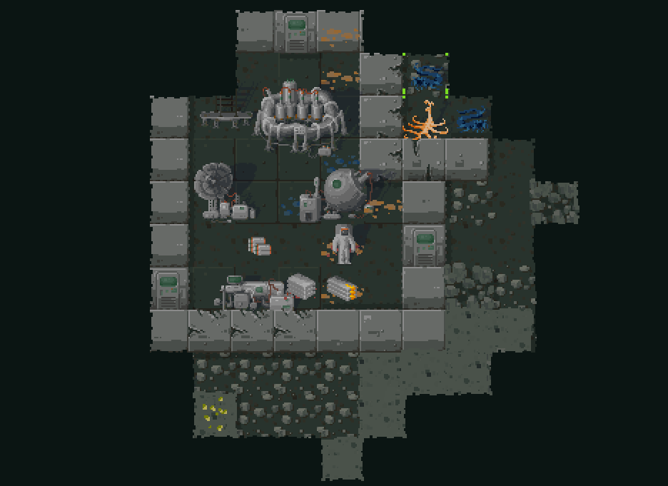 Эта игра - рогалик. Несложный, не нагружающий обилием фич. В основе классическая механика: ходим по пещерам, ищем полезные ресурсы. Из особенностей - нет ближней атаки, вместо этого игрок может ставить мины. Также строительство базы. Не просто строительство, но и оборона. Окружающий мир враждебен и точно опасен для хрупкого оборудования.