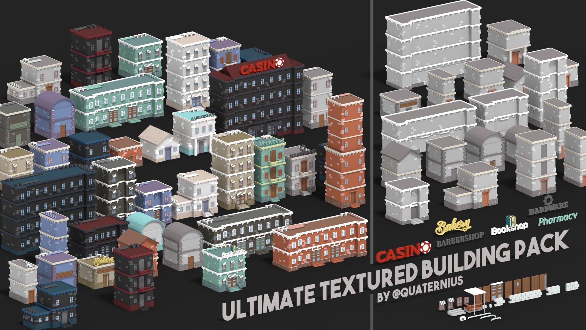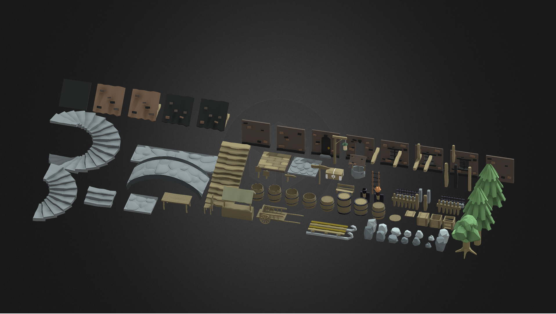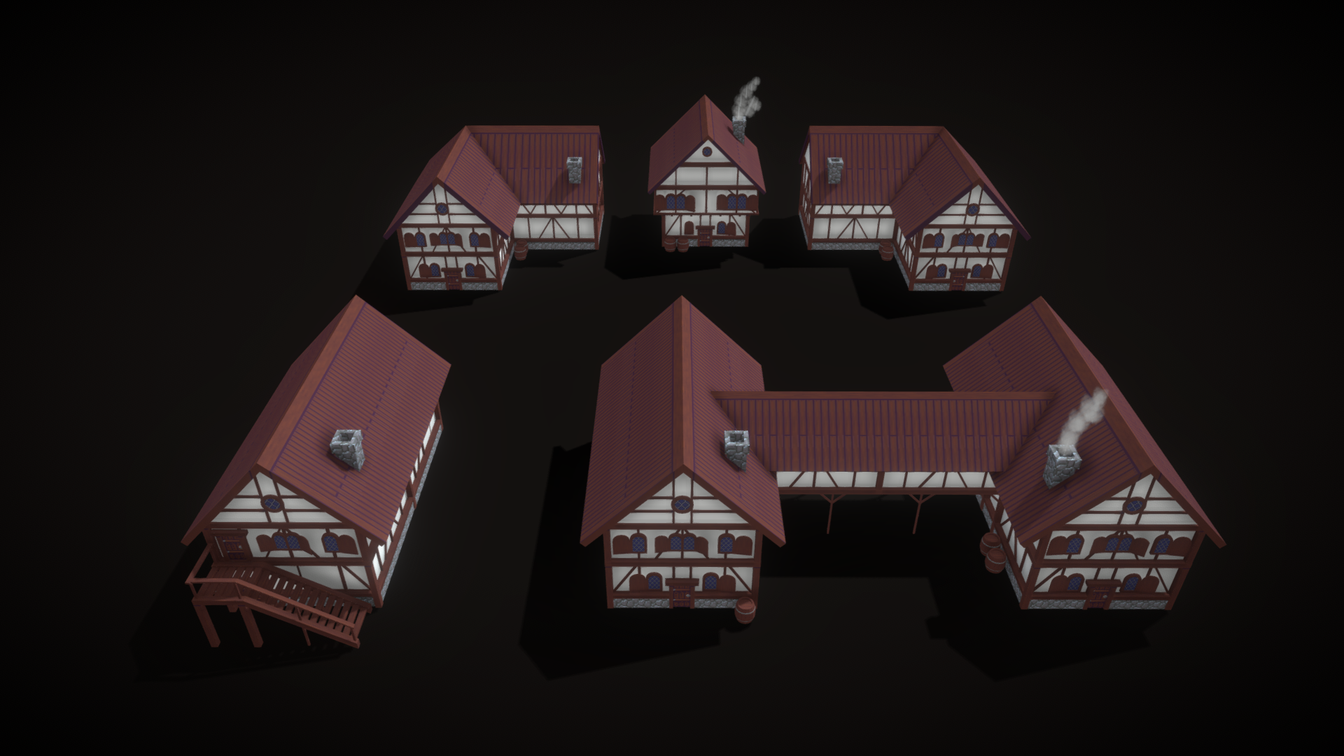 Модульный набор medium-poly для строительства среднего прибрежного городка. Все модели уже установлены на fbx-сцене как пример застройки.