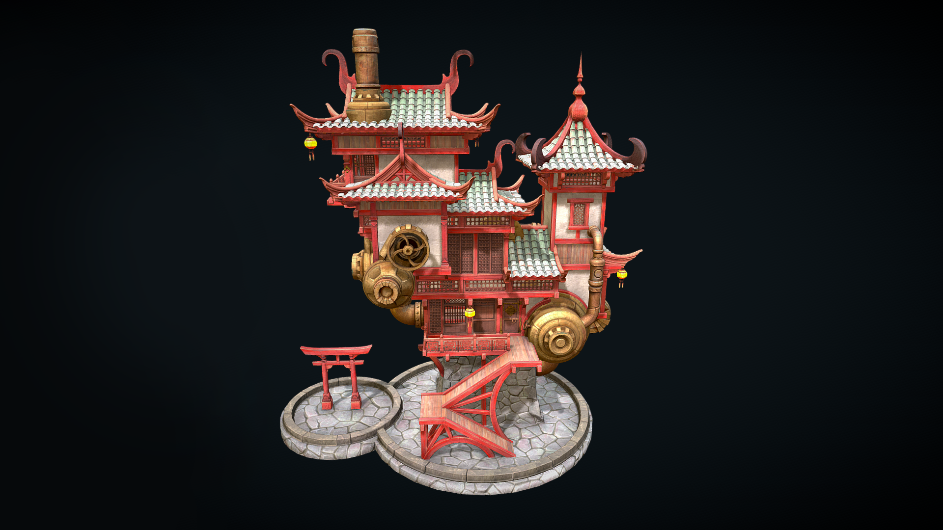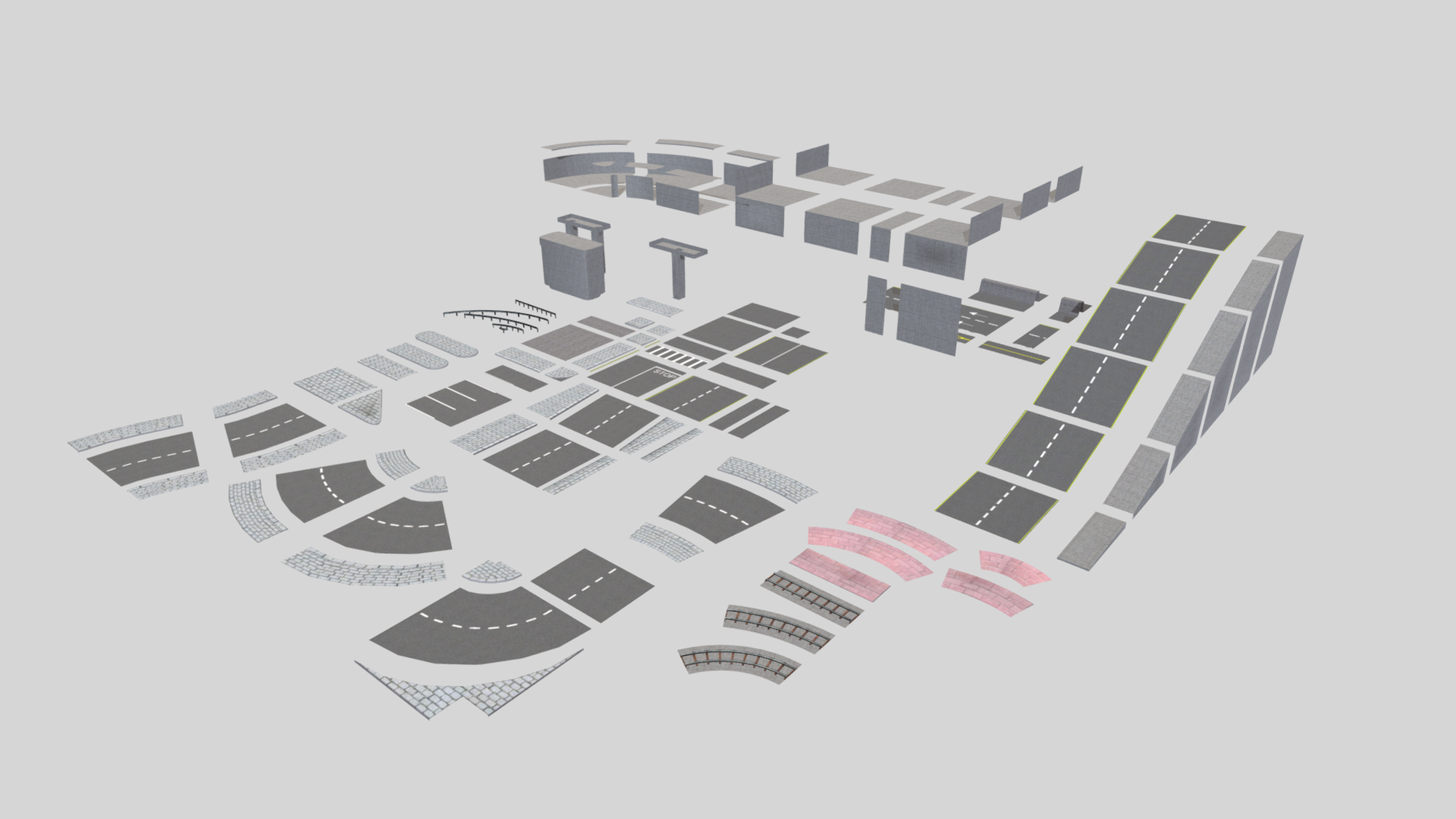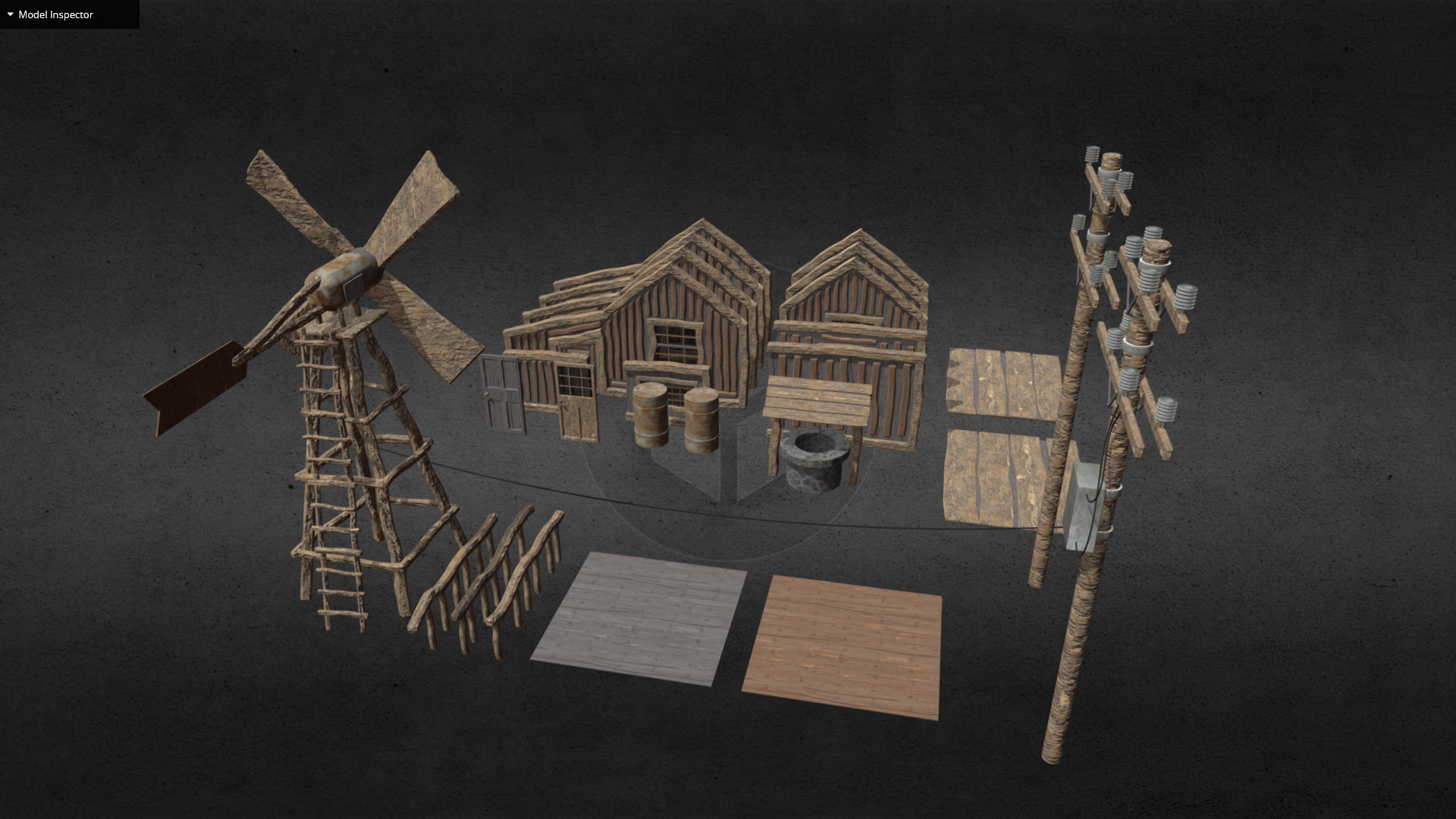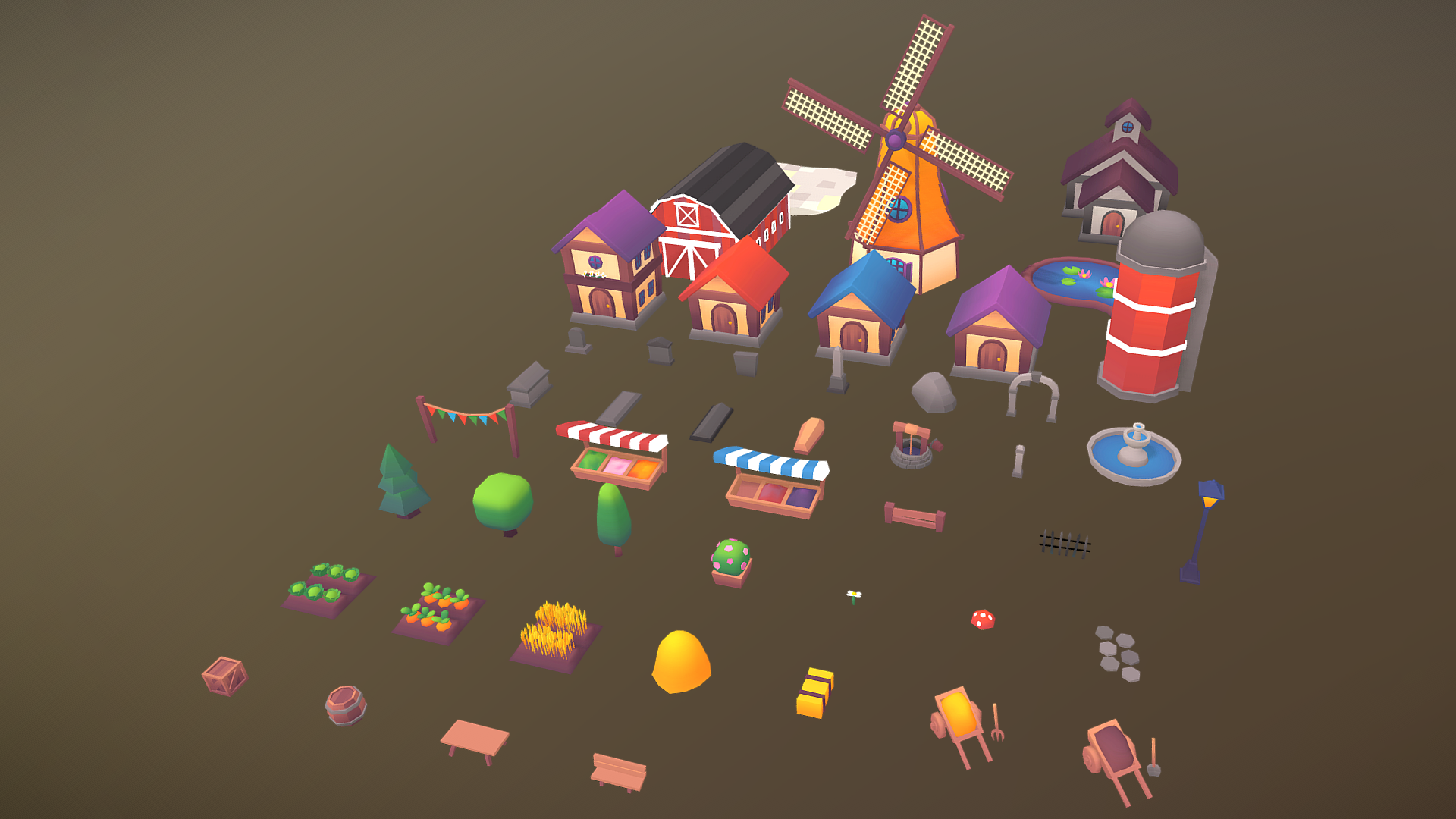 Модульный набор medium-poly для строительства среднего прибрежного городка. Все модели уже установлены на fbx-сцене как пример застройки.